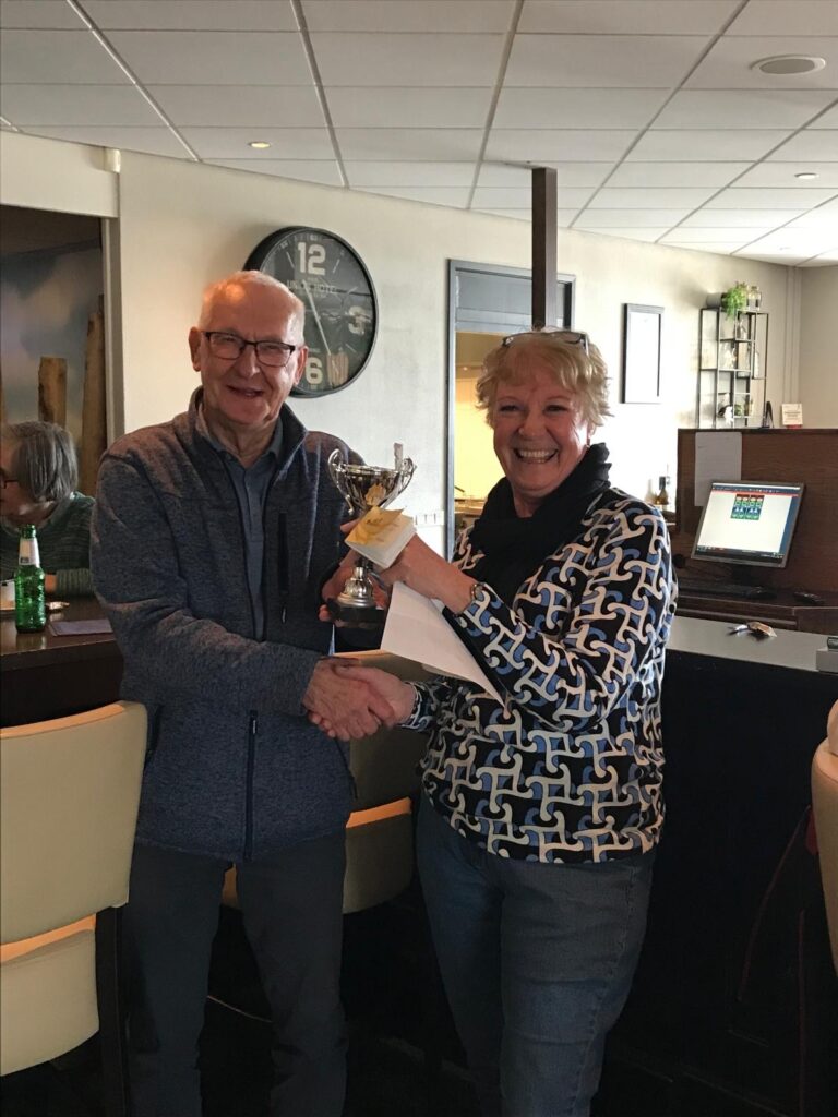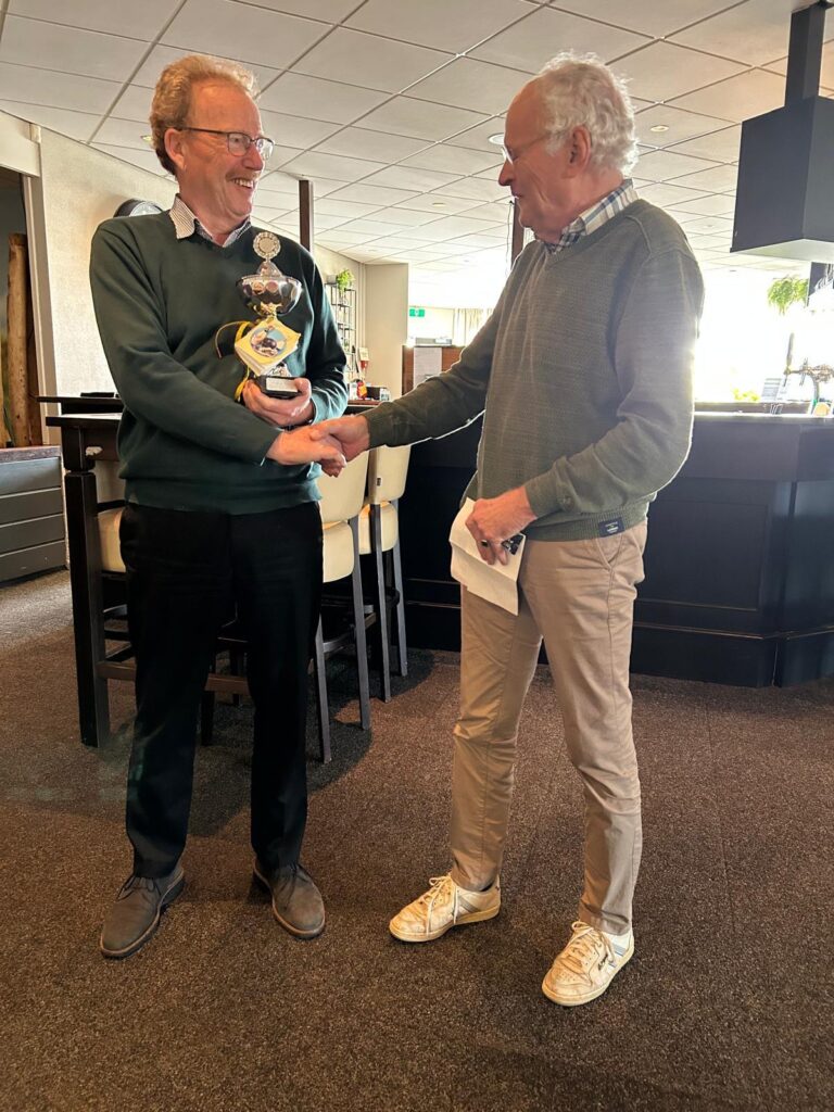 Twee fotos van de jaarlijkse bowlingwedstrijden 2025 op 26 en 28 februari. De wisselbekers worden trots in ontvangst genomen.